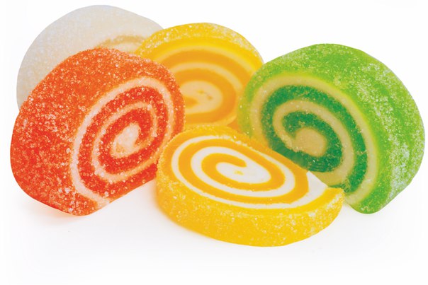 Фруктовый двухслойный мармелад в форме рулета в сахаре.